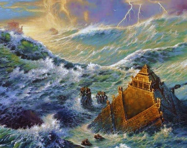 Atlantis, for instance, is judged with a great flood after attempting to overthrow the whole Mediterranean to create an empire for Poseidon, according to Plato.